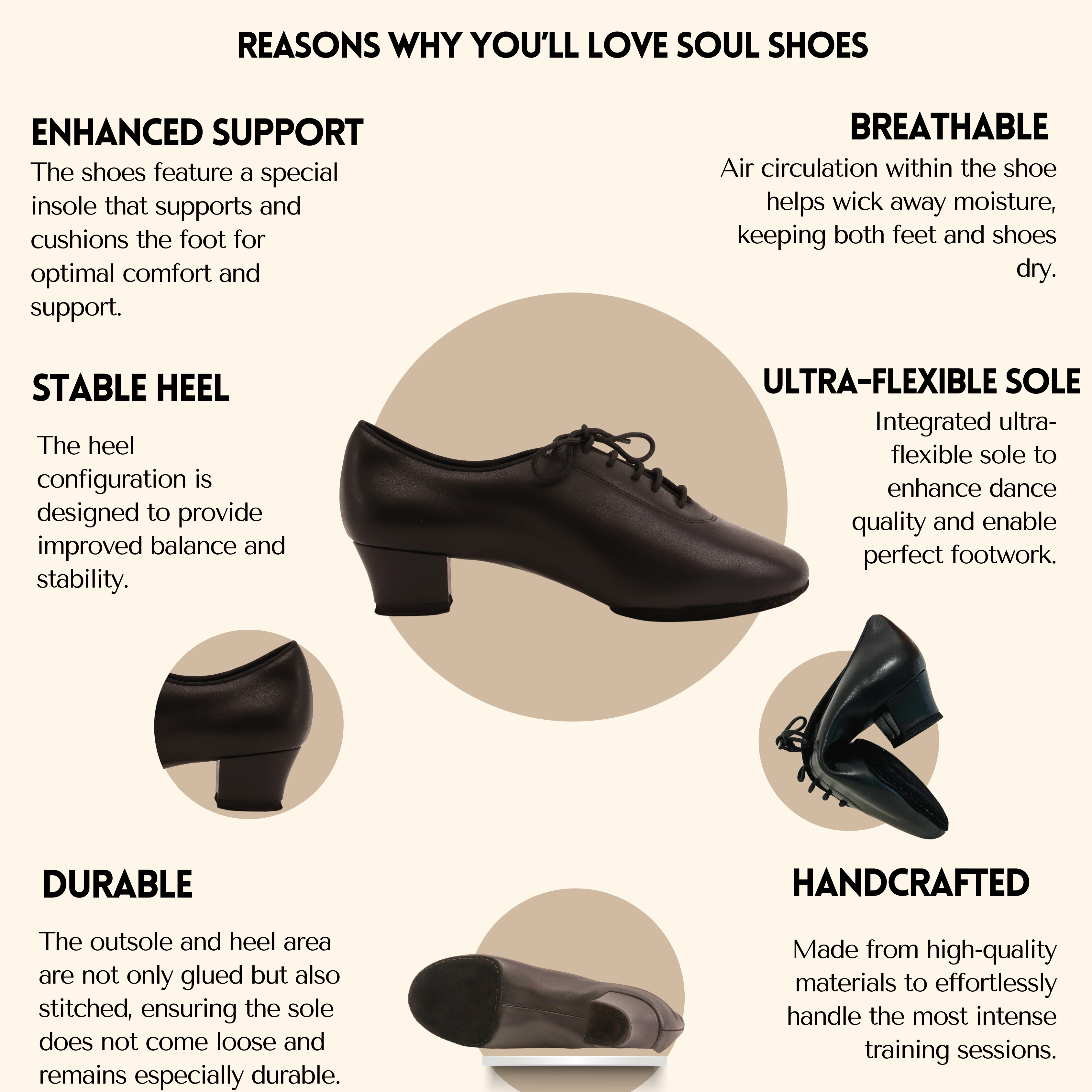Die Mehrheit der Tanzschuhe von Soul ist mit einer flexiblen Sohle ausgestattet. Diese Sohle ermöglicht eine hervorragende Fußarbeit und Flexibilität, da sie sich gut beugen lässt. Der Supinator ist kürzer gestaltet, um diese Biegung zu erleichtern. Im Gegensatz dazu ist eine normale Sohle mit einem etwas längeren Supinator gestaltet und daher weniger flexibel. Die flexible Sohle ist sowohl für Profis als auch für Amateure geeignet, während die normale Sohle für Einsteiger in die Welt des Tanzens empfohlen wird.